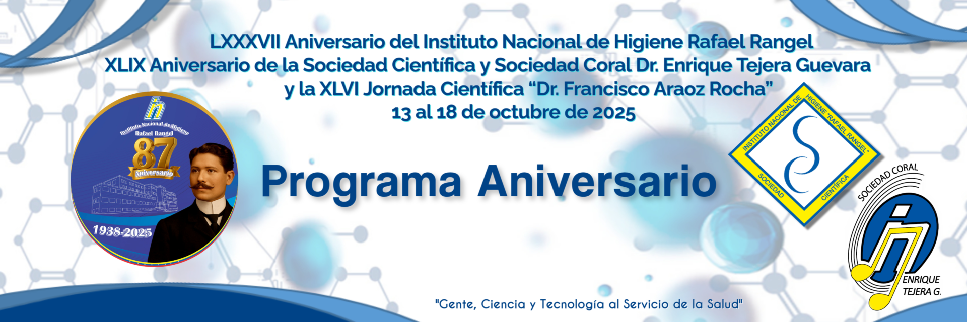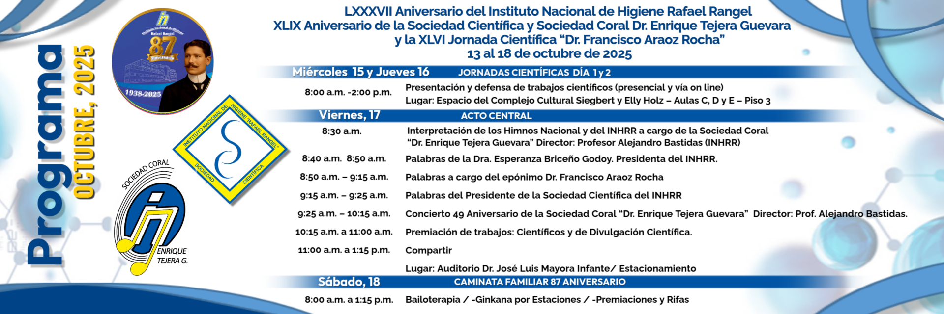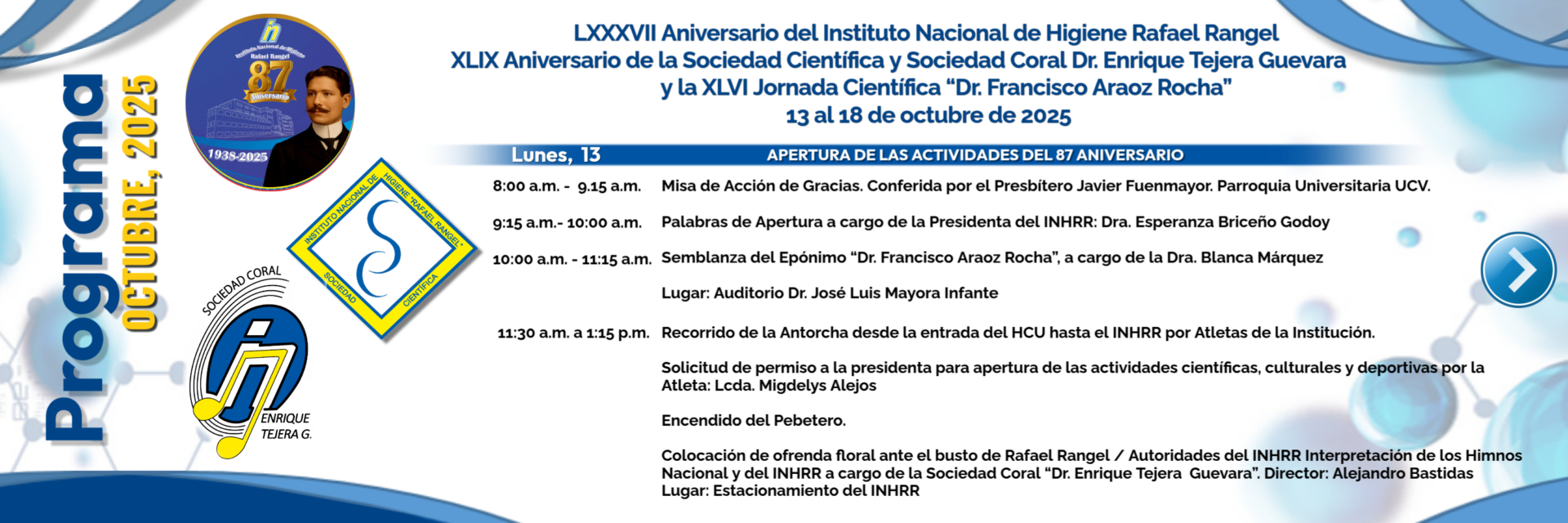 El Instituto Nacional de Higiene Rafael Rangel (INHRR), con motivo de celebrar su LXXXVII Aniversario, el XLIX aniversario de la Sociedad Científica y la Sociedad Coral Dr. Enrique Tejera Guevara y la XLVI Jornada Científica Dr. Francisco Araoz, invita a toda la Comunidad Científica Nacional e Internacional, estudiantes, entes adscritos al Ministerio del Poder Popular la Salud (MPPS), y al público en general, a disfrutar de una serie de actividades de carácter técnico científico, culturales y deportivas, que tendrán lugar en la sede de nuestra institución, que inicia el 13 10 2025 y culmina el 18 10 2025.